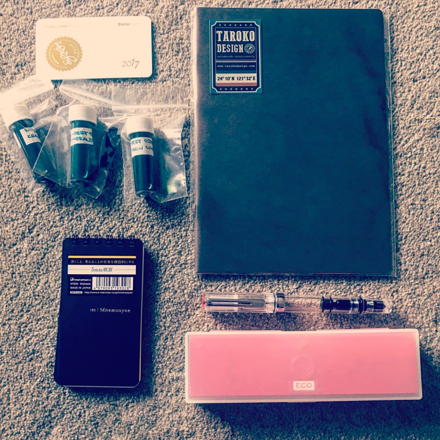 Insane haul at two: Taroko Notebook, Mnemosyne Notebook, and Robert Oster Green Ink Samples