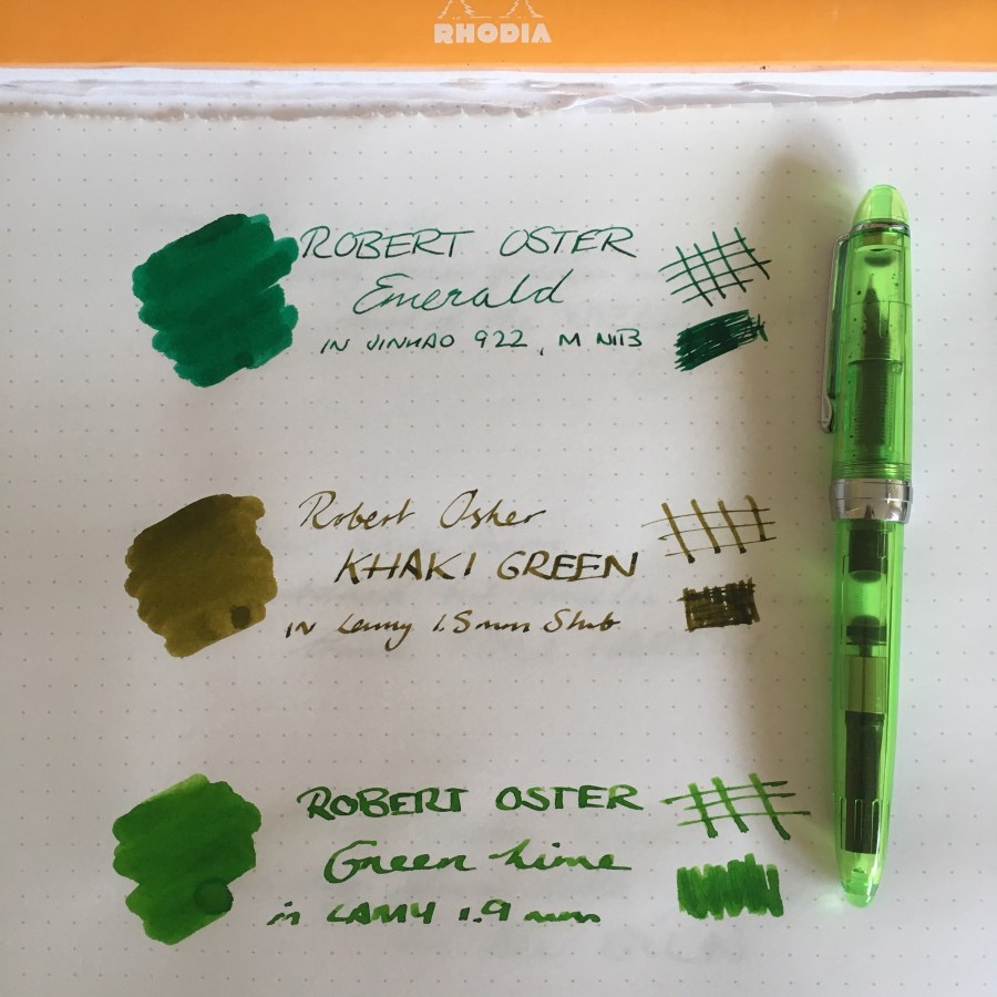 erhm, yes… these green inks. They are nice. I harbor suspicions that Robert Oster is trapped in a basement laboratory under Uluru, cursed to formulate new inks until he’s created one for every color in the spectrum.